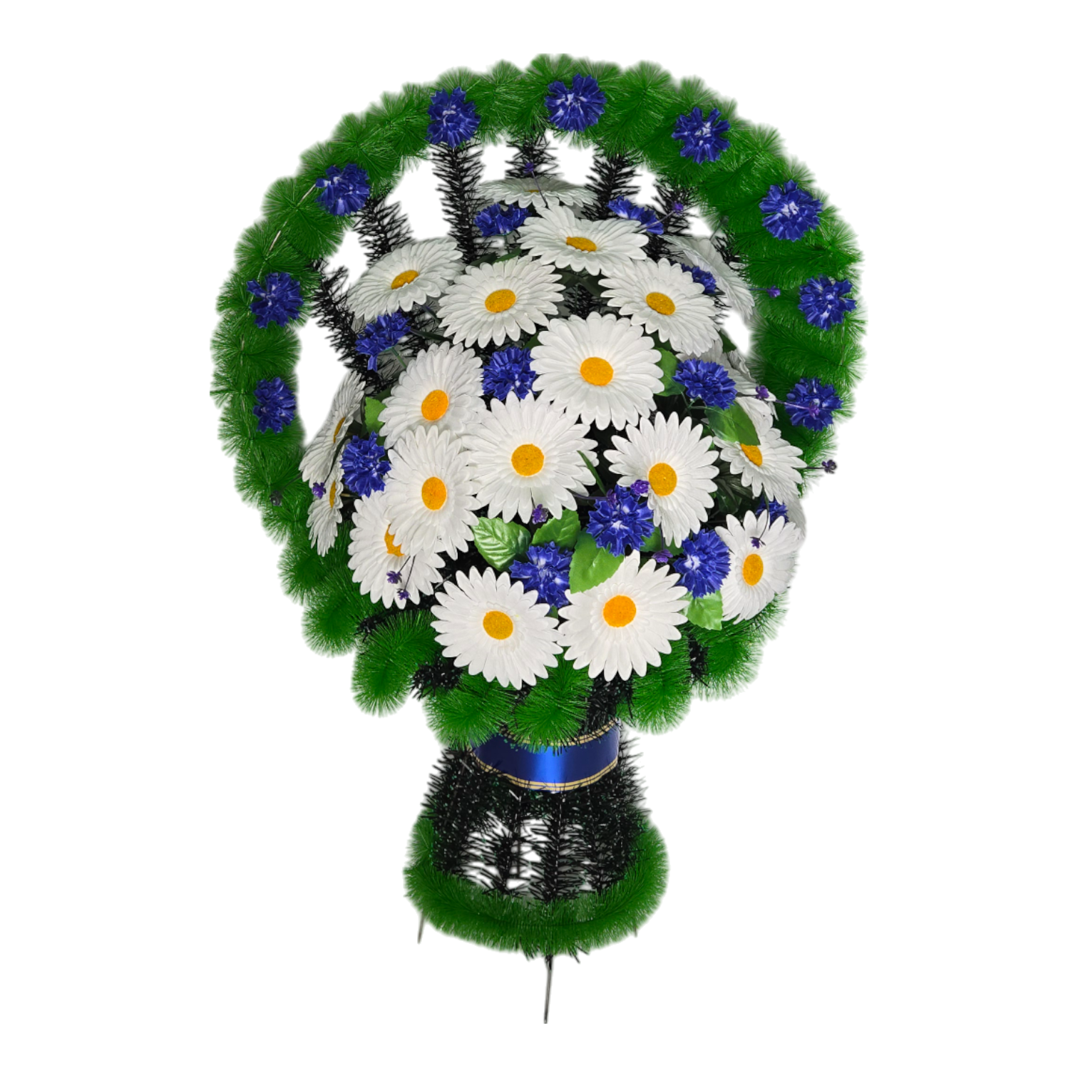 Корзина «Т-37 Васильки-Ромашка» — ритуальный венок, символизирующий вечную память, уважение и скорбь. Он используется в церемониях прощания, похорон и поминовений. Композиция может быть выполнена из живых или искусственных цветов, с включением зелени, лент и декоративных элементов. Благодаря прочной основе и стойким материалам, венок сохраняет форму и презентабельный вид даже при неблагоприятных погодных условиях. Мы предлагаем широкий выбор форм: круглые, овальные, в форме сердца или крестов. Ленты с надписями можно персонализировать, чтобы передать чувства от имени родственников, коллег или друзей.